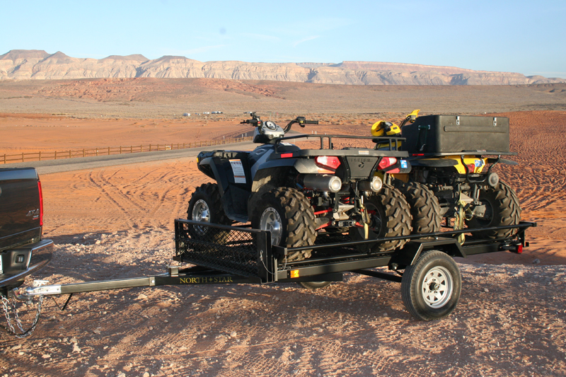 Todo es más divertido en pares! Tomar dos grandes vehículos todo terreno en el Sportstar II. Fácil carga lateral para la capacidad de "drive-en-drive-off". Este remolque tiene un marco de acero para mayor resistencia y un acabado de pintura en polvo duradera. montaje de neumáticos de repuesto se encuentra en la parte superior de la lengua para dar cabida a un neumático de repuesto, soporte del gato y el gas pueden acumular. puerta rampa con rampas de carga lateral. resortes de hojas múltiples. iluminación DOT-aprobado.